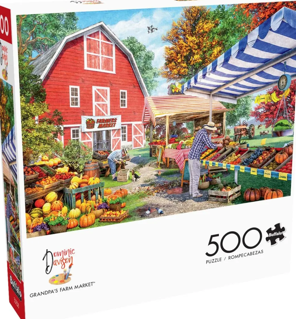 This 500-piece jigsaw puzzle, Grandpa’s Farm Market, is part of the Country Life Collection by Buffalo Games, and from artist Dominic Davison. In front of a big red barn, crates and stands of produce have been set out for a farmer’s market. From pumpkins, to tomatoes, apples, and bananas, Grandma and Grandpa are busy making sure everything looks great! Every Buffalo Games jigsaw puzzle is manufactured from recycled puzzle board. A precision cutting technique guarantees that every piece will fit soundly with the company’s signature Perfect Snap™. A bonus puzzle poster is also included so that you have a handy reference of what the completed puzzle should look like while you put yours together.