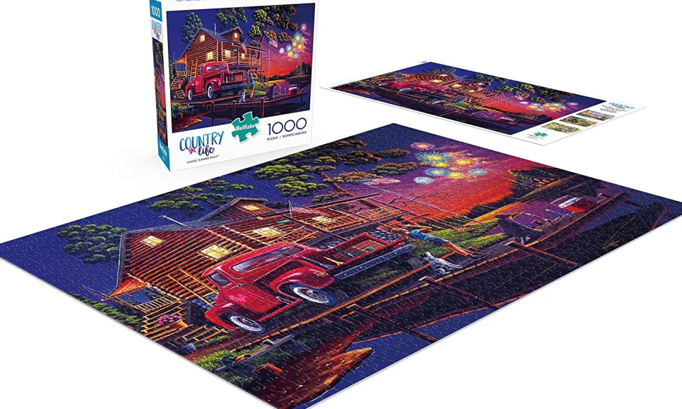 In this puzzle titled Classic Summer Night, two siblings’ Fourth of July excitement has just begun. A boy is seconds away from lighting off his favorite fireworks, while his sister watches a display, just across the lake. This 1,000 piece puzzle is part of the Country Life series by Buffalo Games. Enjoy piecing together this puzzle, all-year round. Every Buffalo Games jigsaw puzzle is manufactured from recycled puzzle board. A precision cutting technique guarantees that every piece will fit soundly with the company’s signature Perfect Snap™. A bonus puzzle poster is also included so that you have a handy reference of what the completed puzzle should look like while you put yours together.f