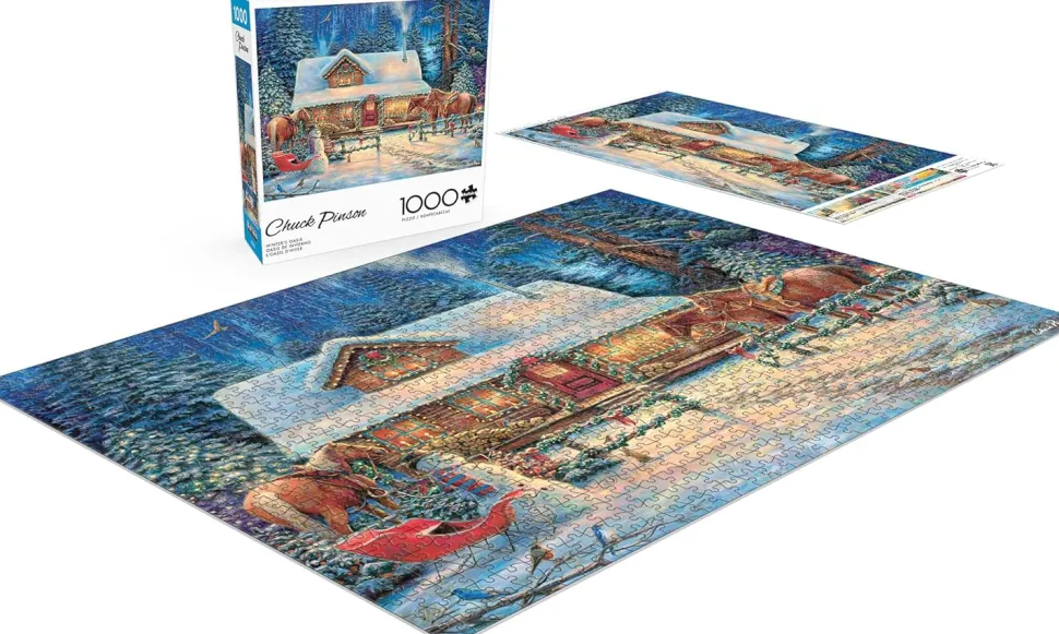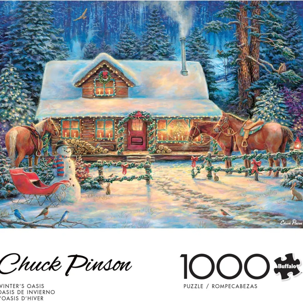 This 1000-piece jigsaw puzzle, Winter’s Oasis, is based on the artwork of Chuck Pinson. Every Buffalo Games jigsaw puzzle is manufactured from recycled puzzle board. A precision cutting technique guarantees that every piece will fit soundly with the company’s signature Perfect Snap™. A bonus puzzle poster is also included so that you have a handy reference of what the completed puzzle should look like while you put yours together.