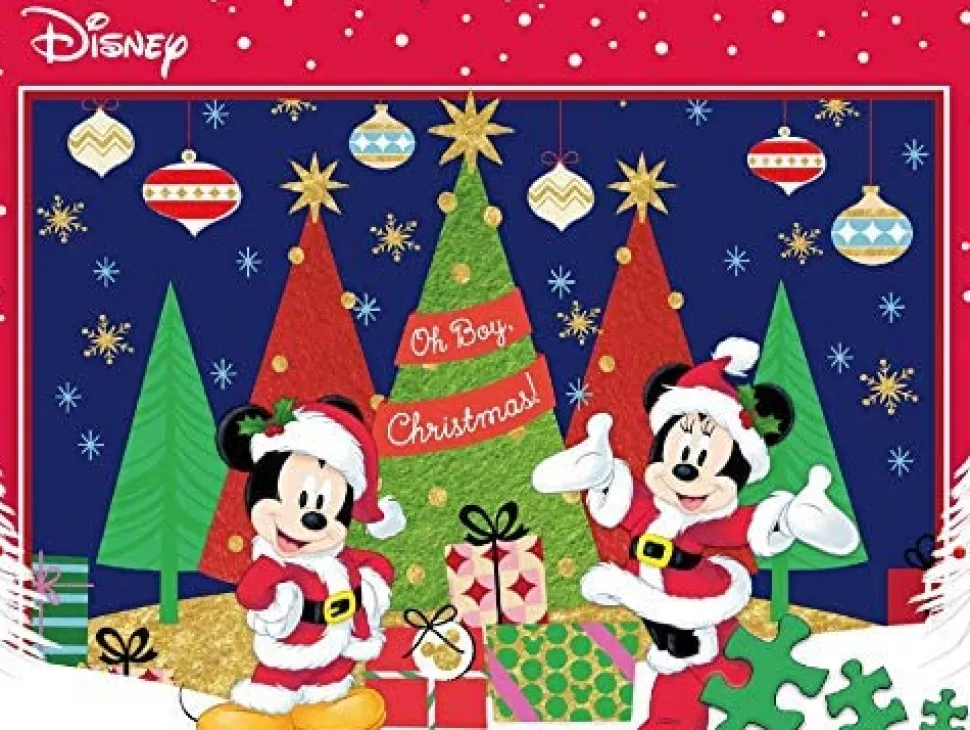 - Features a colorful puzzle of Mickey and Minnie Mouse celebrating the season!