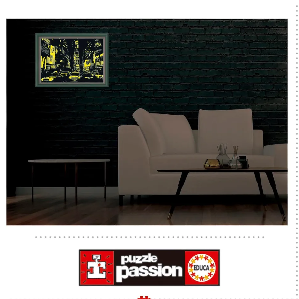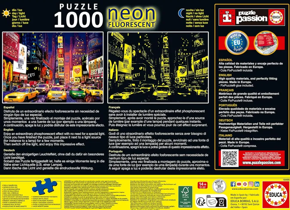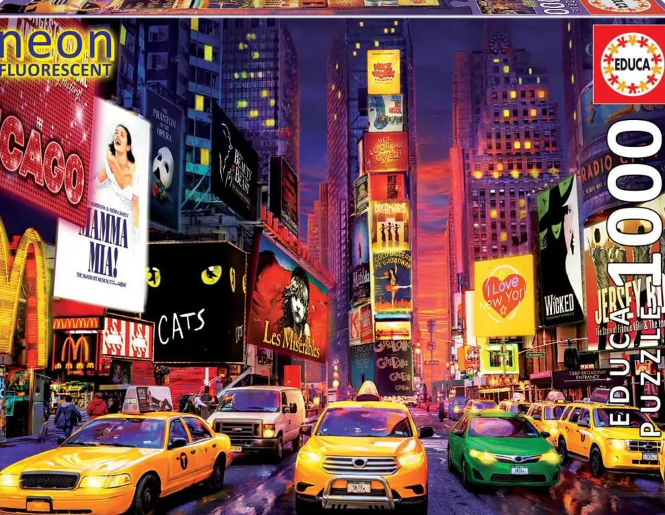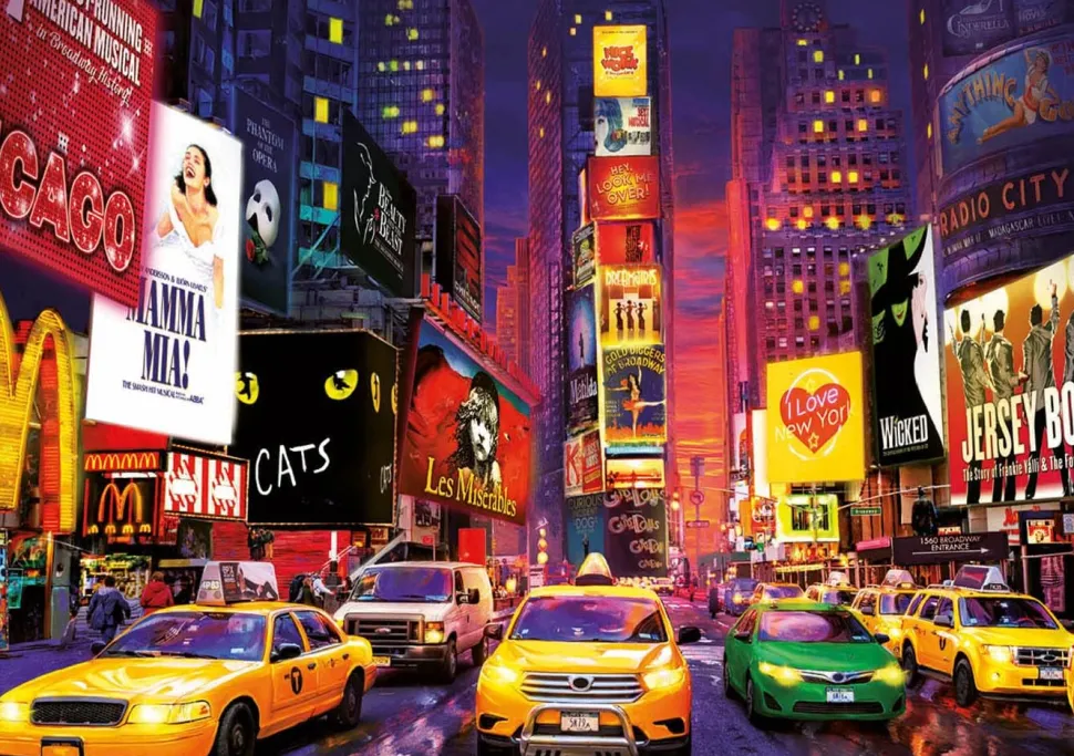 - Discover the busy road crossing between Broadway and Seventh Avenue in New York with the high quality 1000 piece puzzle. In the evening, the numerous advertising boards and lights also shine on the puzzle, because it glows in the dark