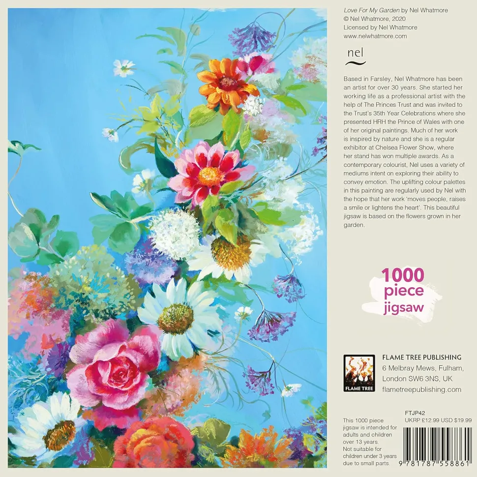 Part of an exciting series of sturdy, square-box 1000-piece jigsaw puzzles from Flame Tree, featuringpowerful and popular works of art. This jigsaw will satisfy your need for a challenge, featuring NelWhatmore’s Love For My Garden. This 1000 piece jigsaw is intended for adults and children over 13 years.Not suitable for children under 3 years due to small parts.Nel Whatmore is a fine artist, well known for her floral paintings, landscapes and abstracts. As acontemporary colourist, her paintings are both expressionist and evocative. Nel is a regular exhibitor atChelsea Flower Show where her stand has won multiple awards including a Five Star Award this year. Herwork can be seen in many forms all over the world. She seeks to constantly explore mediums and theirability to convey emotion, including poetry – she has six books of poetry published called the ‘Reasons toBe’ series.Finished Jigsaw size 735 x 510mm