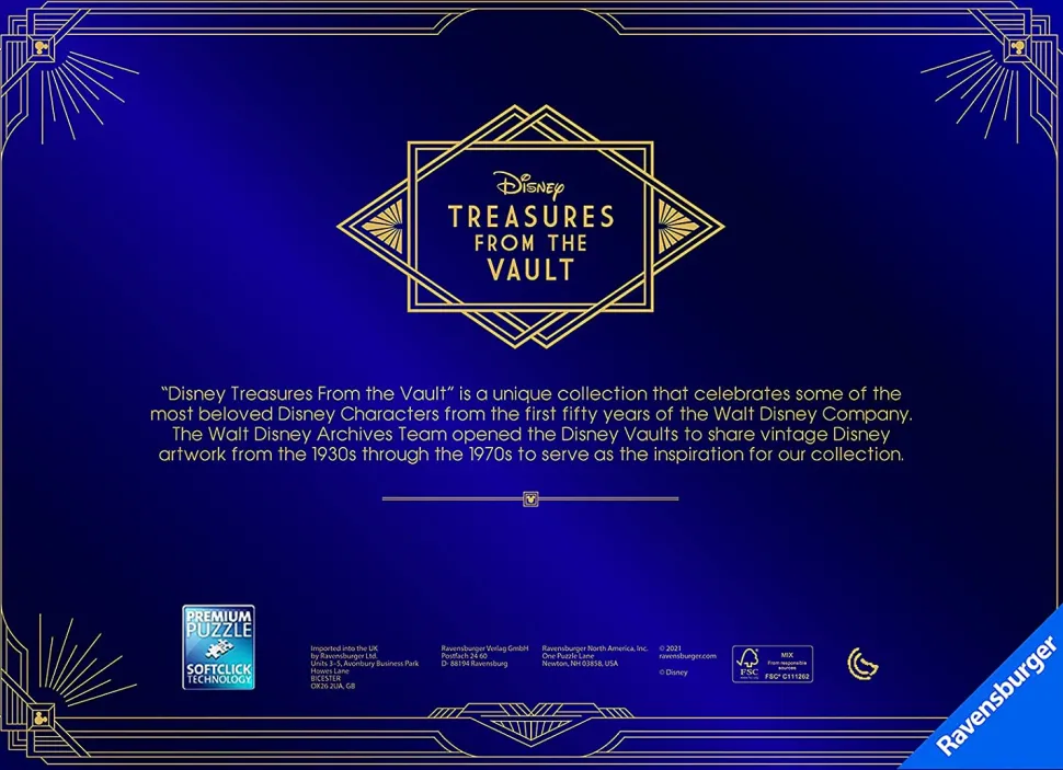 - What you get – 1000 piece Disney Treasures from the Vault jigsaw puzzles by Ravensburger are crafted with premium quality, in terms of both content and material, and have a completed size of 27″ x 20″.