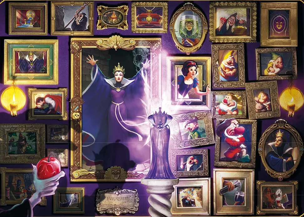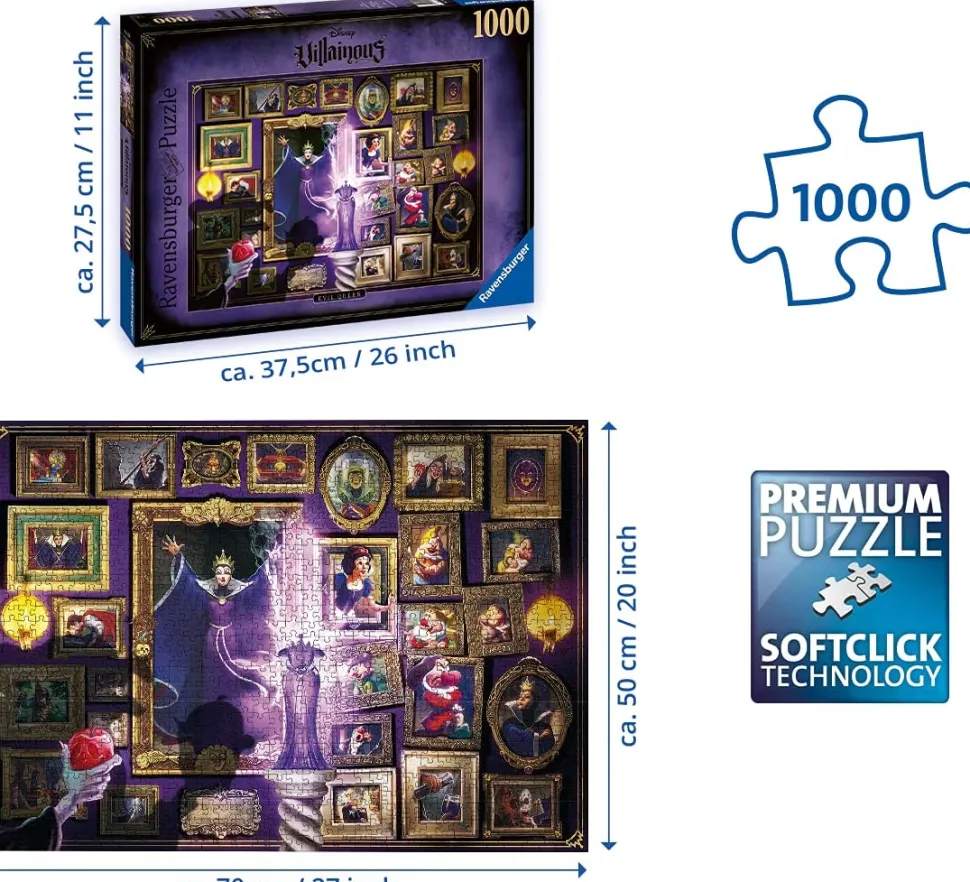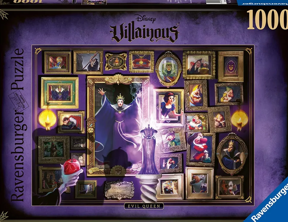 This magical puzzle stars the wicked Evil Queen, and echoes the game elements and style of the hit game Villainous. High quality 1000 piece cardboard jigsaw puzzle. The finished puzzle measures 70 x 50cm when complete. Suitable for ages 12 years and up. Made from strong premium grade cardboard, with linen finish print to minimise glare on puzzle image.